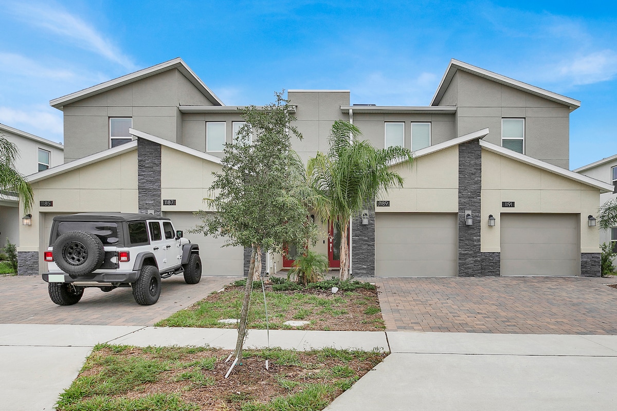 NYBYGD privat hjem. Nyt en stilfull opplevelse med fullt utstyrt kjøkken og ALT helt nytt. Plass til opptil seks personer i tre soverom/to bad. Inkluderer én KINGSIZE-seng og fire enkeltsenger med en TV i hvert rom. Nyt arkadespillet og slapp av i det avslappende åpne rommet. Koble til trådløst nettverk og nyt det dedikerte arbeidsområdet. Trygt og sikkert smart hus i et inngjerdet nabolag. Tilgang til bassenger i feriestedstil, idrettsbaner med mer. Minutter fra flere underholdningssteder, inkludert Disney, shopping og restauranter i nærheten.