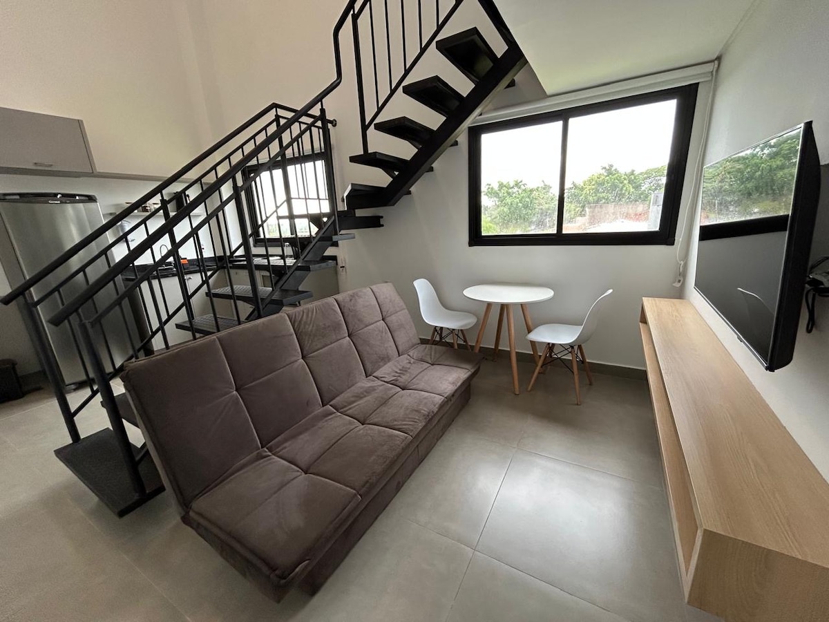 Loft compacto, moderno e novo, ideal para quem busca conforto e ótima localização em Foz do Iguaçu. Totalmente mobiliado, conta com quarto aconchegante, cozinha equipada, banheiro moderno e móveis novos e funcionais. Ideal para turistas, casais com 1 ou 2 filhos pequenos, ou até 3 adultos confortavelmente, sendo a segunda cama um sofá-cama. Localização estratégica, próxima a atrações turísticas, shopping, mercados e restaurantes. Excelente custo-benefício.