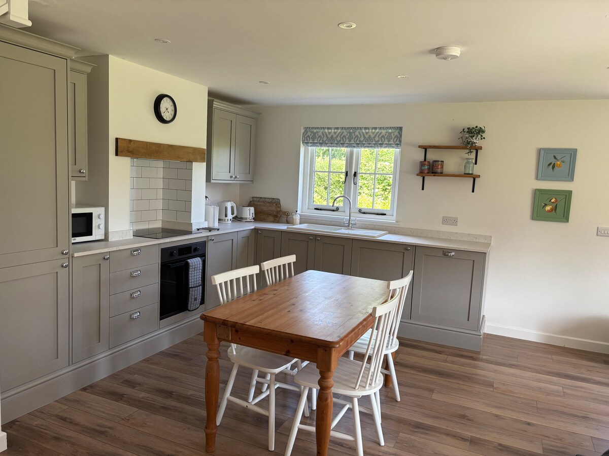 A beautiful oak framed building with great views of the south downs. Accommodation comprising of a comfortable lounge with TV and wifi and log burner. The kitchen is well equipped with a dishwasher, oven and microwave. One double bedroom downstairs with en suite shower room. Upstairs there is a mezzanine with two single beds and a sitting area above the lounge area with a bathroom with free standing bath. The outside space is a south facing patio with table and chairs and a BBQ is available.