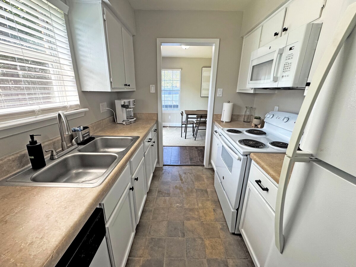 Hei! Velkommen til Howdy Home i Bryans sjarmerende historiske distrikt – bare ti minutters gange til Bryans sentrum. Perfekt for besøk til Texas A&M (bare 6 miles unna) eller Legends Event Center (7 minutter unna). Nyt enkel innsjekking/utsjekking uten vert, et fullt utstyrt kjøkken og privat bakgård med bålplass + cornhole. Slapp av med 65 tommers TV og Sonos-lyd. Seks sengeplasser: én kingsize-seng, én queensize-seng, to enkeltsenger. Bestill din avslappende Bryan-ferie!