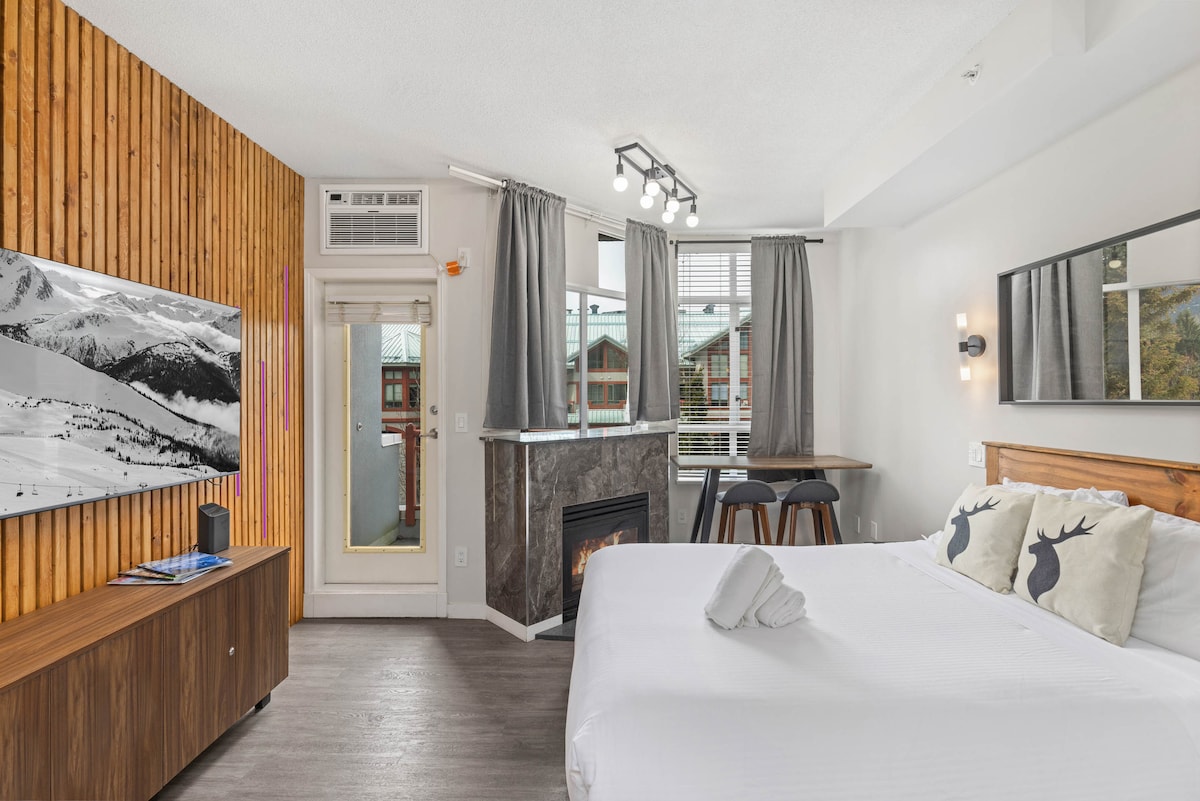 Spacious 1BR condo with 2 King beds and 700+ sq ft of comfort in the Village. Sleep soundly in a king bed, king wall bed, or single pullout. Relax by the cozy fireplace or enjoy the new air conditioning on a summer day. Enjoy smart TVs, streaming music, and a shared outdoor hot tub. Keyless entry, family-friendly, and steps to shops, dining, the bike path. A short walk to lifts. Free underground secure parking, fast Wi-Fi, and secure bike storage. The perfect home base for your mountain getaway.