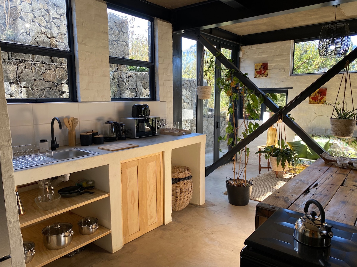 Dette unike stedet har sin helt egen stil. Leilighet med ett soverom og eget bad, som er knyttet til et hovedhus med selvbetjeningsfasiliteter. Stuen varmes opp av en vedfyrt peis, og soverommet har eget bad og klimaanlegg. Braai-fasiliteter på stedet samt en smart-TV med DSTV og trådløst nettverk. To til tre km fra sentrum, på en fjellside. Det er nederste nivået i et treetasjes hus, men helt privat og ikke påvirket av strømbrudd.