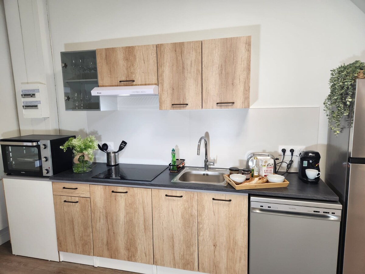 Opplev den ultimate komforten i vår 80 m2 leilighet, som ligger mellom Louvre Lens og Lens stadion. Nyt et boblebad for to personer med 95 jetstråler, en 165 cm 4K OLED-TV. Utstyrt kjøkken. Badet har en italiensk dusj, hengende toalett, et LED anti-dugg speil og en håndkletørker. Soverommet har en stor seng på 180 x 200 cm, et opphengt nett på 10 m2 med et lerret på 260 cm, en sofa, et sofabord, en Nespresso-maskin og en UHD 4K HDR-projektor.