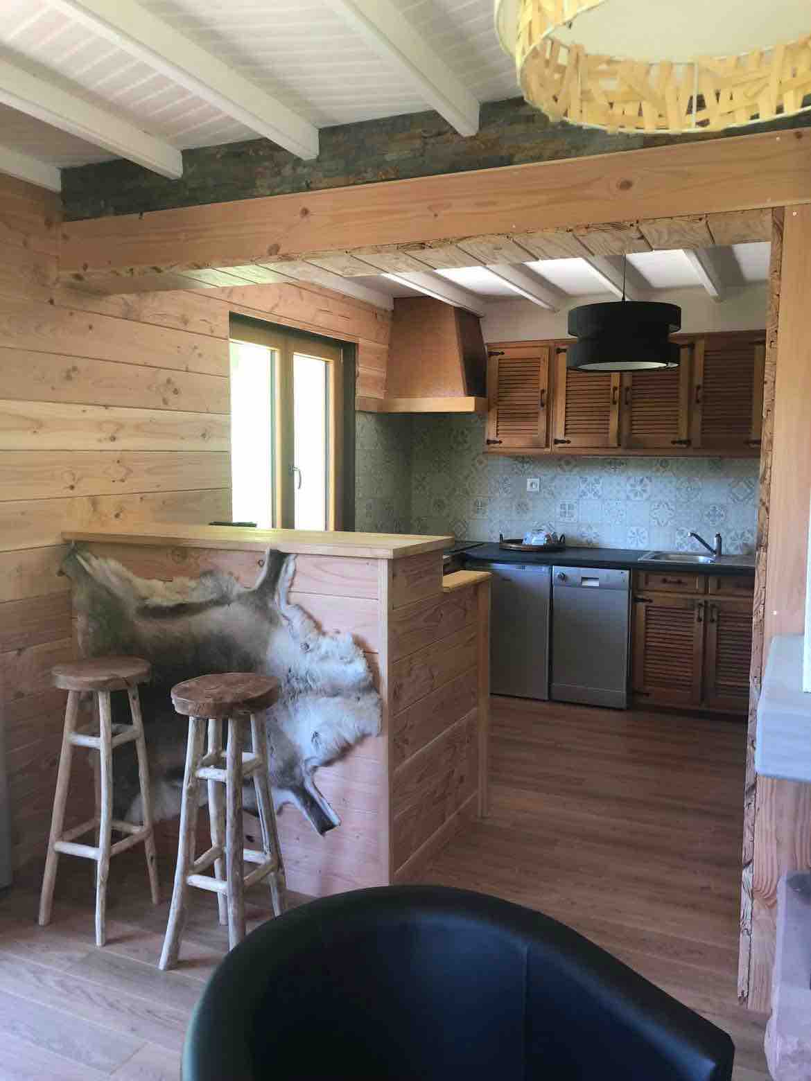 En stor treterrasse i nivå med stuen Hytta består av º 1. etasje: Bad, toalett, stue / spisestue med peis / kjøkken º 1. etasje: WC, 4 soverom ° I eksternt anneks: Badstue 4 personer og spa 5 personer Spillområde (biljard, fotball) seng og rom gjort, laken, dyne og pute følger med ALTERNATIVER: badstue / spa: 50 € per opphold 2 håndklær og 1 vaskeklut 5 € / person alternativ dyr: 30 € per dyr for oppholdet røykfritt