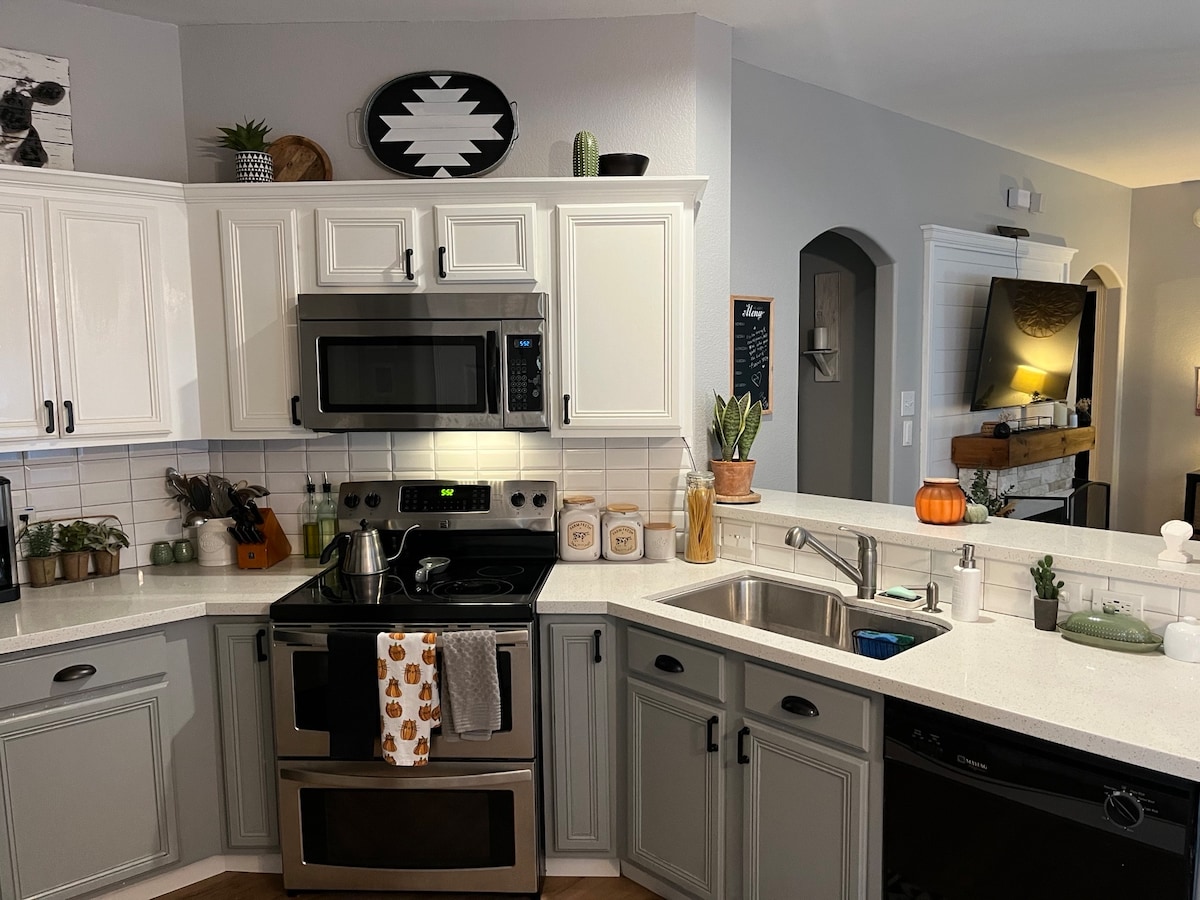 Vårt koselige tilfluktssted tilbyr luksuriøse fasiliteter: et badekar, helt ny A/C, høyhastighets trådløst nettverk, en 70-tommers Roku-TV, et drømmekjøkken og et eget kontor. Hjemmet er perfekt plassert, en kort kjøretur fra I-45, slik at du raskt og enkelt kan reise nordover til Houston eller sørover til Galveston. Nabolaget tilbyr parker, dammer, turstier og en hundepark. Dette er det perfekte stedet for cruisere som reiser fra Galveston eller reisende som ønsker å oppleve Greater Houston-området.