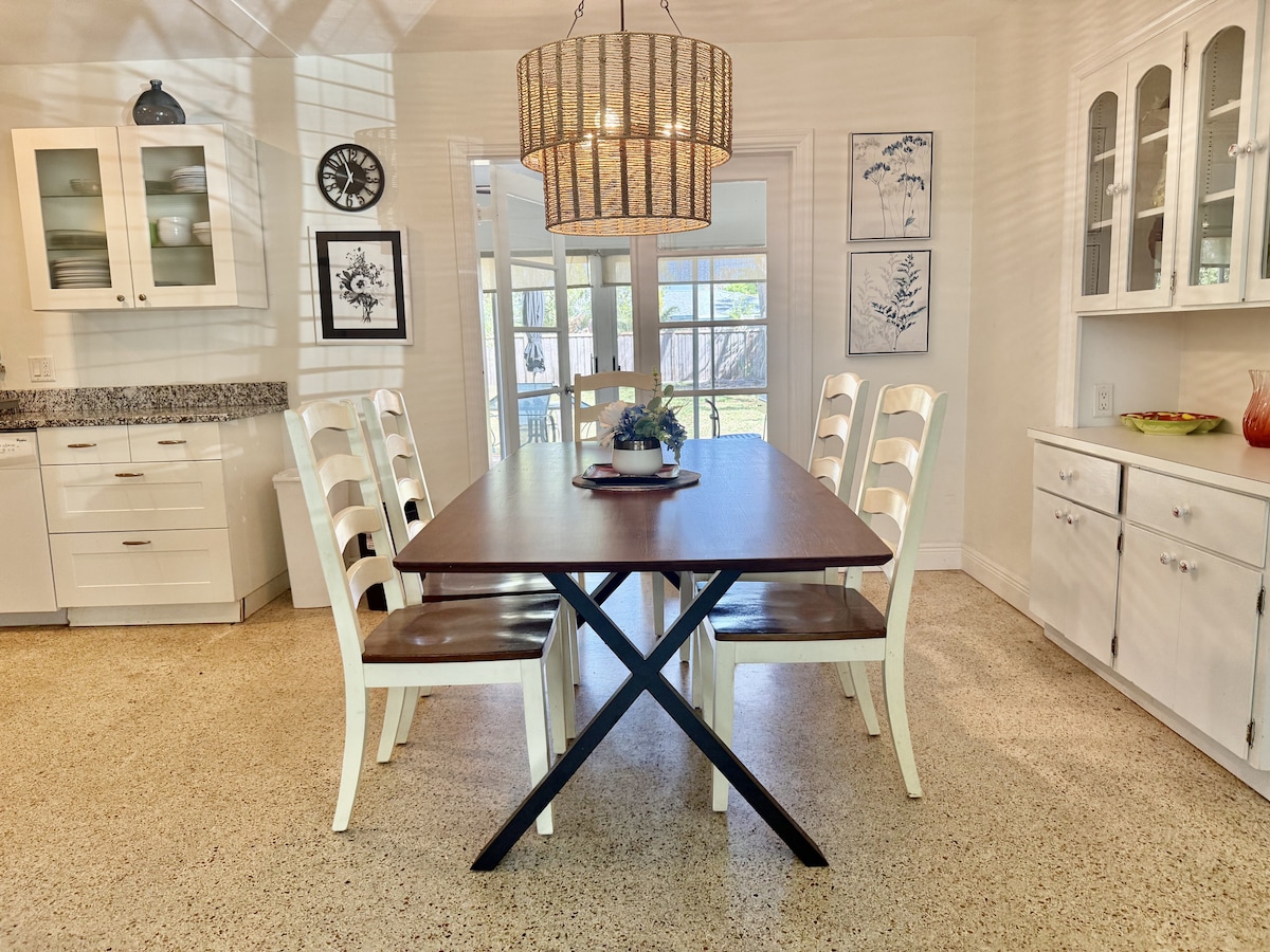 Oppdag sjarmen til Sarasota i vårt nyrenoverte feriehus med to soverom og ett bad. Bare 1,6 miles fra vakre Siesta Key Beach! Nyt morgenkaffen på en terrasse i murstein omgitt av blomster og solskinn. Våre komfortable senger, mørkleggingsgardiner og rolig nabolag sikrer en søt dyp søvn. FIOS wifi og tre smart-TV-er, et fullt utstyrt kjøkken og et glitrende nytt bad med to vasker, et stort speil og marmordusj tilbyr alle hjemmets bekvemmeligheter. Vi ønsker deg velkommen!