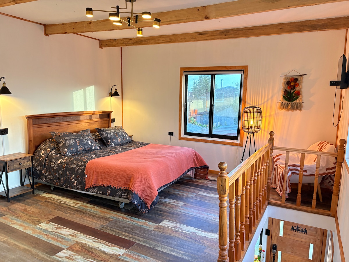 Dette vakre minihuset ligger i en privilegert sektor av Frutillar, med spektakulær utsikt over innsjøen Llanquihue og vulkanene. Stjernen på stedet er ✨ jacuzzien✨: Ligger på terrassen og med den beste utsikten du kan ha, er det den perfekte enden for en dag med å gå rundt i dette vakre området. Den er fylt med alt du trenger for et komfortabelt og avslappende opphold. Den har en kingsize-seng, Nespresso-kaffemaskin, kullgrill, TV med Direct TV og trådløst nettverk.