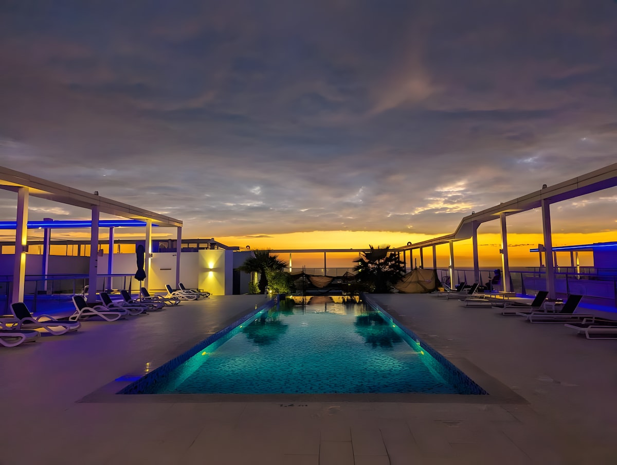 Opplev det ultimate tilfluktsstedet i den stilige og moderne leiligheten vår, perfekt designet for både uforglemmelige ferier og produktive forretningsreiser. Unn deg komfort og bekvemmelighet – den perfekte ferien venter! Den har spektakulær utsikt over havet og bybildet, et fullt utstyrt kjøkken og trådløst nettverk med høy hastighet. Nyt eksklusiv tilgang til et basseng på taket, et treningssenter og en strand. Med gratis parkering er det den perfekte ferien for par og familier som søker komfort i byen.