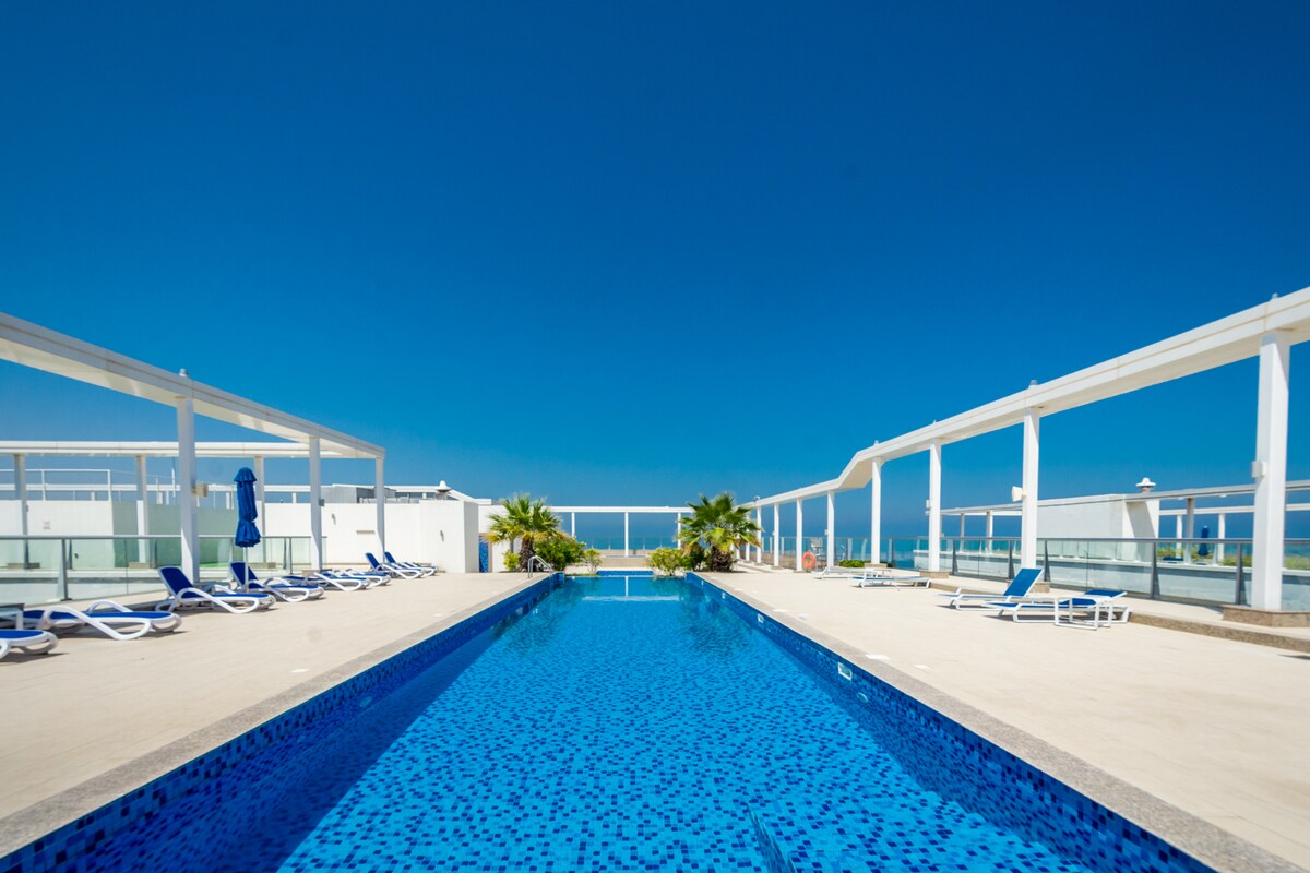 Vakker leilighet med full havutsikt og tilgang til en privat strand. Unn deg selv en fullt utstyrt leilighet med tilgang til mange fasiliteter, som svømmebassenger på taket, tennisbaner, badstuer, treningsstudioer og mer!