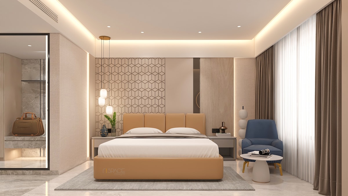 Opplev luksus i våre 750 kvadratmeter. Presidential Suite i Gachibowli – perfekt for bedriftsopphold. Romslig, elegant og fullt utstyrt med eget bad, trådløst nettverk med høy hastighet og concierge-støtte. Gå til de beste restaurantene og hotellene. Du når Hitech City og Financial District på 10–20 minutter. Perfekt for ledere som ønsker komfort, privatliv og bekvemmelighet i Hyderabad's viktigste forretningsområde.