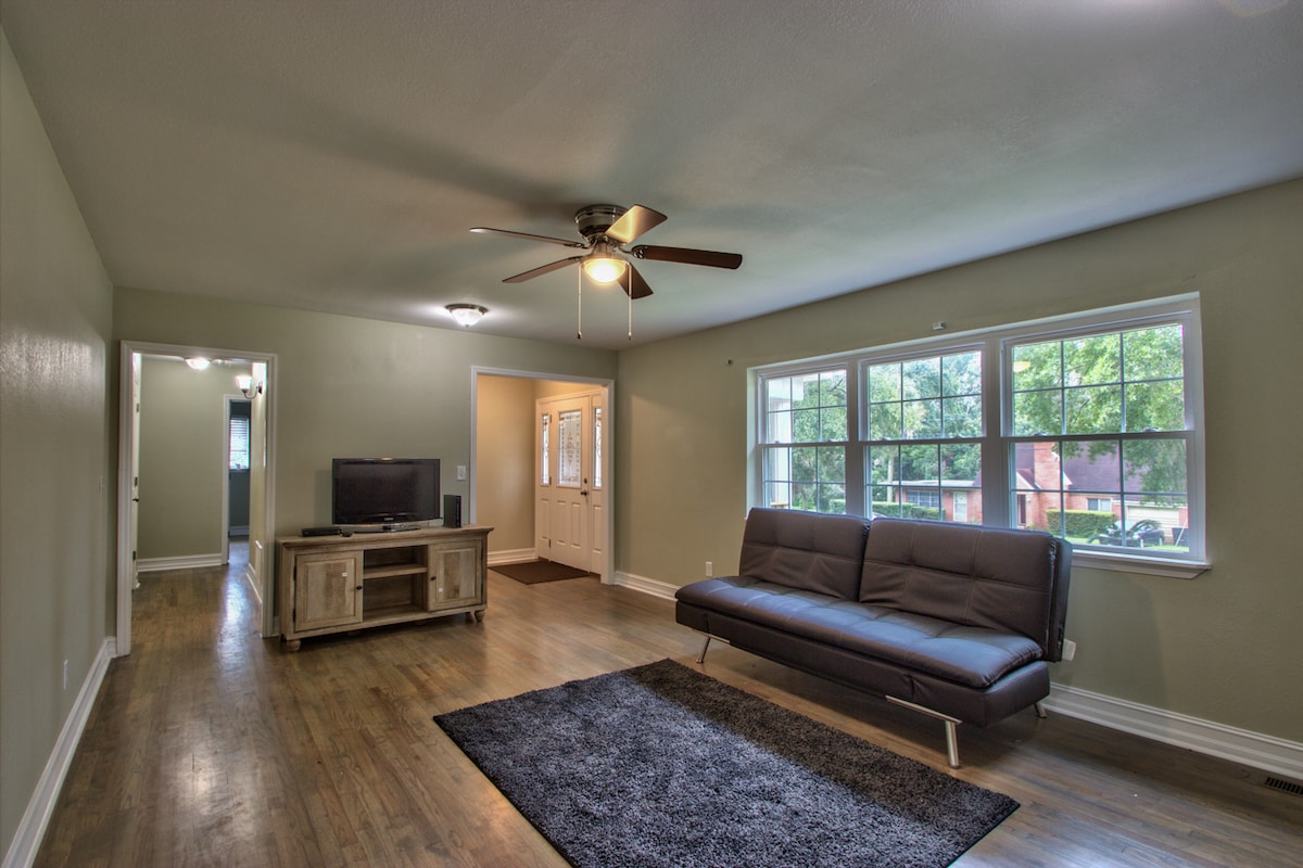 Slapp av med hele familien eller ha en respektfull sammenkomst (ingen fest) i dette koselige og velutstyrte hjemmet, som ligger i et trygt og rolig nabolag. Det har et åpent kjøkken/stue/peisområde, med alle apparater i et vanlig hjem, 60 tommers smart-TV (i tillegg til en TV på hvert soverom). Stor, overbygd veranda for å nyte grillen sammen. De tre soverommene har plass til åtte personer totalt, og det er mulig å ta imot fire personer til i stuen.