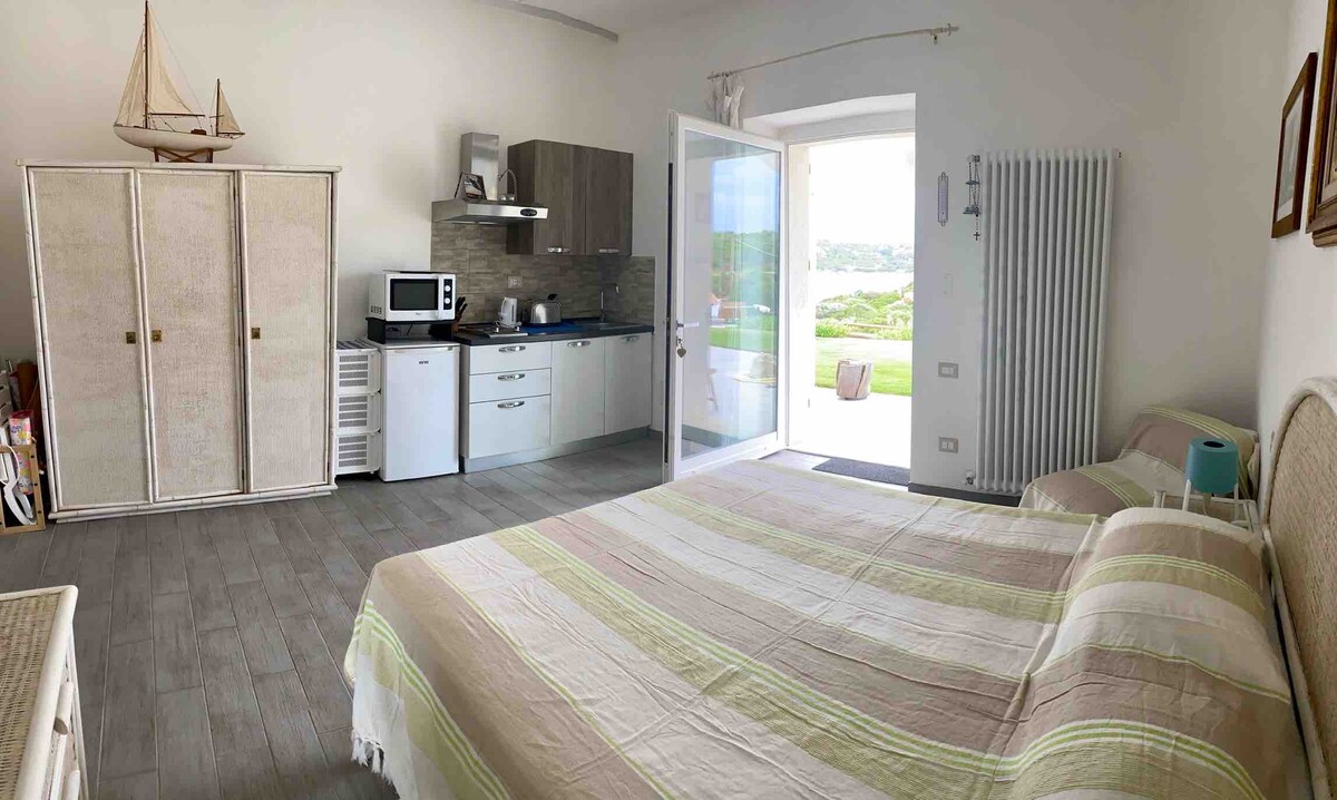 Hyggelig og uavhengig studioleilighet, med fri og gratis tilgang til svømmebassenget (SALTVANN, IKKE KLOR), praktisk talt med sjøvann!!! Komplett med alt ... dobbeltseng, romslig bad, satellitt-TV, aircondition, oppvarming, kjøkkenkrok, klassisk ovn, mikrobølgeovn, kjøleskap, vaskemaskin og parkering Ideelt for litt avslapning, fred og ro om natten! Den huser komfortabelt 2 personer, og en tredje hvis det er et barn i en VUGGE! 30 kvadratmeter pluss overbygget veranda!