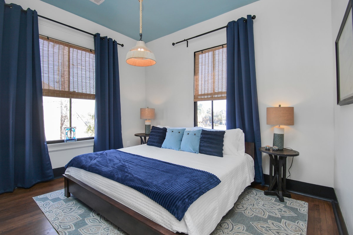 Moderne komfort i en historisk Galveston-leilighet 🌴✨ Bo noen skritt fra East End Historic District, The Strand, og cruise-terminaler i denne lyse leiligheten fra 1912. Vi har beholdt den opprinnelige sjarmen – høye tak, store vinduer, tregulv – og oppdatert for dagens liv. ☕ Start morgenen med en ny brygg fra Keurig (kapsler inkludert). 📺 Strøm favorittene dine på 43-tommers smart-TV. 🍳 Lag mat som hjemme på det fullt utstyrte kjøkkenet. 🛏 Sov godt på en Nectar minneskummadrass.