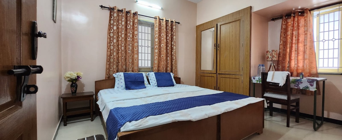 Velkommen til det koselige 1BHK-hjemmet vårt i Ukkadam, Coimbatore – det perfekte budsjettoppholdet! Stedet er rent, komfortabelt og ideelt for enslige reisende eller små familier. Nyt rom med klimaanlegg, gratis trådløst nettverk, drikkevann døgnet rundt, tilknyttet bad, parkering for en liten bil og overvåking. Slapp av på den åpne terrassen eller i fellesområdet. Det ligger i nærheten av markeder, restauranter og transportknutepunkt, og det er et fredelig hjem med alt det nødvendige for et komfortabelt opphold. Kjæledyr tillatt. Klesvask er tilgjengelig på forespørsel