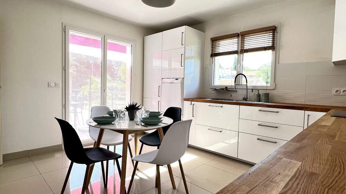 La maison se compose de 2 grandes chambres avec dressings, un lit king size et un canapé BZ (+lit bébé), d'une cuisine et d'une salle à manger entièrement équipées, d'une salle de bain lumineuse, ainsi qu’une buanderie avec lave-linge. L’extérieur comprend un espace ombragé pour des moments de détente en plein air, et un lieu de stationnement sécurisé. Sa proximité avec les commerces, restaurants et attractions locales en fait un choix idéal pour profiter pleinement de votre séjour.