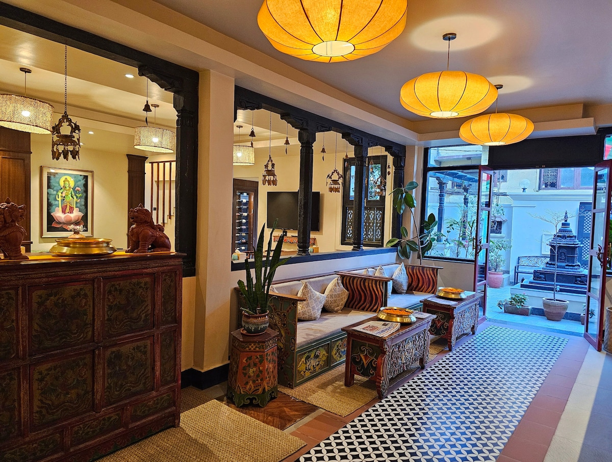 Welcome to a heritage stay in the heart of Thamel, Kathmandu. Nestled in a peaceful, stone-paved alley, our heritage hotel offers a calm escape near the city’s vibrant center. Enjoy a rooftop art gallery and yoga space, a cozy café with a private courtyard, and uniquely designed rooms that blend Tibetan design with Nordic simplicity. Experience true old world Nepali charm with modern creature comfort, thoughtful design, and local hospitality at its finest. Please message for availability.