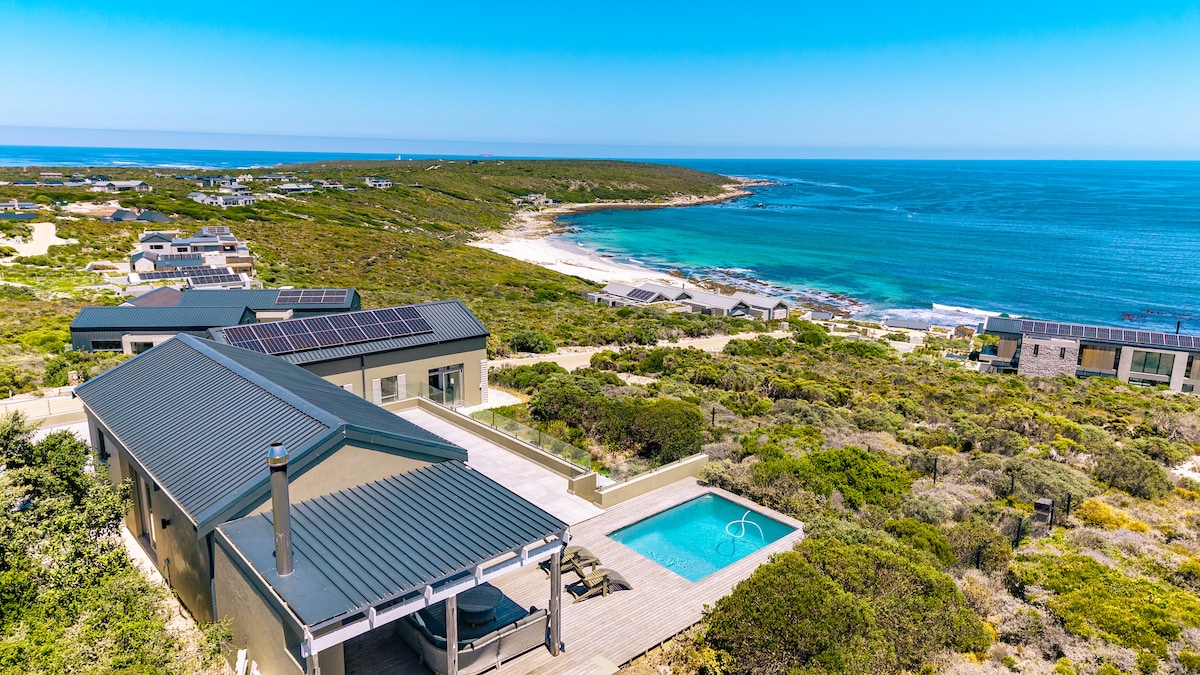 Opplev den ultimate ferien i et luksuriøst, selvforsynt SOLKRAFTDREVET hjem på Romansbaai Estate. Dette moderne tilfluktsstedet tilbyr fantastisk fynbos, havutsikt, og sømløs innendørs/utendørs opplevelse med store skyvedører. Slapp av ved det private bassenget, eller utforsk eiendommens private strand og det frittgående dyrelivet. Med fire rom med eget bad er det perfekt for familier og venner som søker ro. Nyt hvalsafari, strandturer, dyreliv og lokale vingårder – alt rett utenfor døren.
