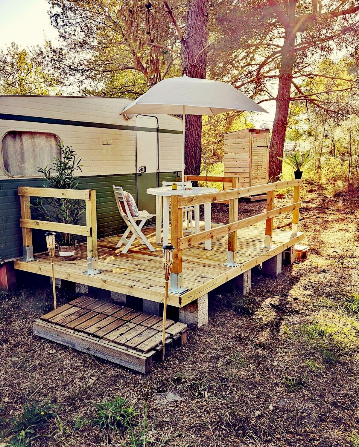 Welcome to our peaceful haven surrounded by nature, in the heart of the Landes region! We offer a unique stay in a fully renovated caravan, ideal for two people. You will enjoy simple and authentic comfort with an outdoor bathroom and kitchen, for total immersion in nature. Here, you'll find just the sound of birdsong and the gentle wooded landscape. 9 km away, you'll find Lake Arjuzanx, and 40 km away, the ocean, where you can swim and cool off in the summer.
