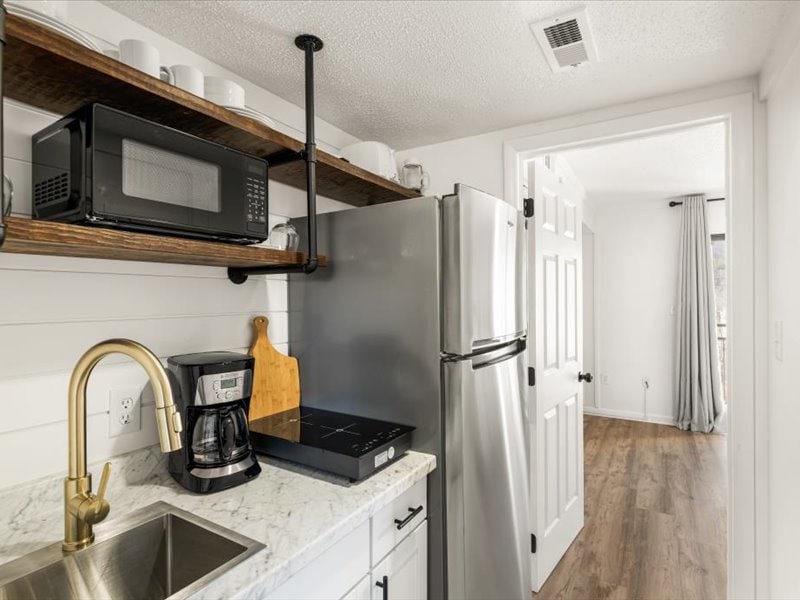 Opplev sjarmen til denne vakkert redesignede leiligheten som ligger rett over hjertet av sentrum av Gatlinburg – men likevel innenfor gangavstand! Nyt en luksuriøs kingsize-seng med eget bad, kjøkkenkrok, to TV-er, trådløst nettverk og en koselig stue med peis. Slapp av ved peisen, drikk kaffe på den private balkongen, ta en forfriskende svømmetur eller utforsk Smokies – valget er ditt! Og hysj … ikke glem den private «hemmelige» trappen vår som fører til sentrum, noe som sparer tid, bry og parkeringsavgifter!