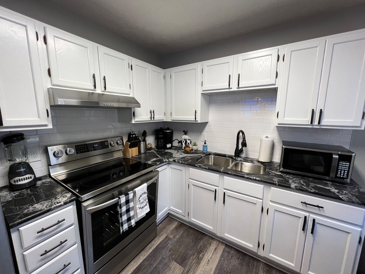 Velkommen til Baby Bear av HoneyBearCabins! Denne vakre leiligheten er toppetasjen av Rustic River Lodge og har egen privat inngang. Sov seks komfortabelt med en queen size-seng, king master suite og to enkeltsenger. Nyt den vakre utsikten fra to store bildevinduer i stuen. Den romslige plassen på 1600 kvm inneholder et velutstyrt kjøkkenområde, med mikrobølgeovn, oppvaskmaskin, kjøleskap, Instapot, kaffetrakter, stor Oster-brødristerovn og vanlig brødrister.