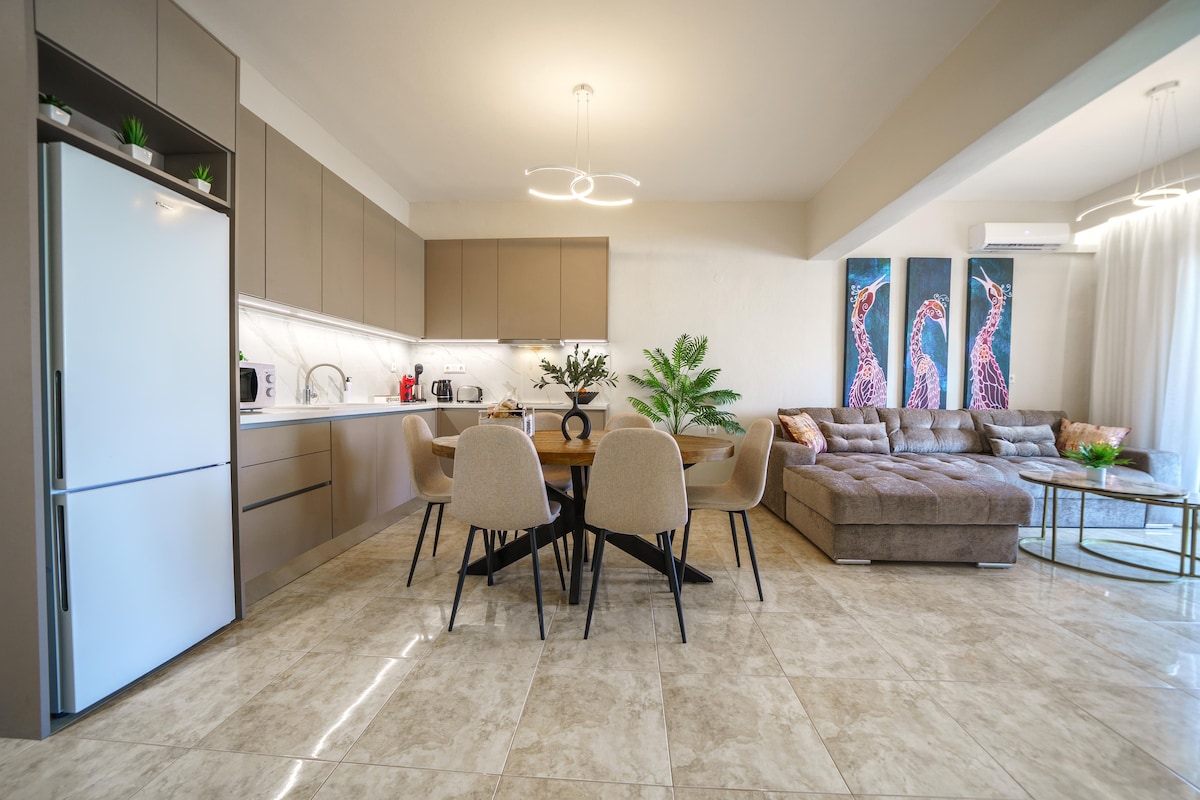 ✨ARTica leilighet 2! Lyst loft i andre etasje for opptil fire personer. Fullt utstyrt for familier og grupper. Det perfekte valget for et kort eller langt opphold! ⭐ Høydepunkter: 🌅 Romslig terrasse med storslått utsikt. 📺 Stue med 65 tommers smart-TV, sovesofa og skrivebord. 🛏️ Soverom med king size-seng 🍳 Fullt utstyrt kjøkken (med oppvaskmaskin). ❄️ Fullt klimaanlegg, raskt trådløst nettverk og parkering. 🏖️ 1,5 km fra Ammoudara-stranden 🏛️ 4 km fra Heraklion sentrum