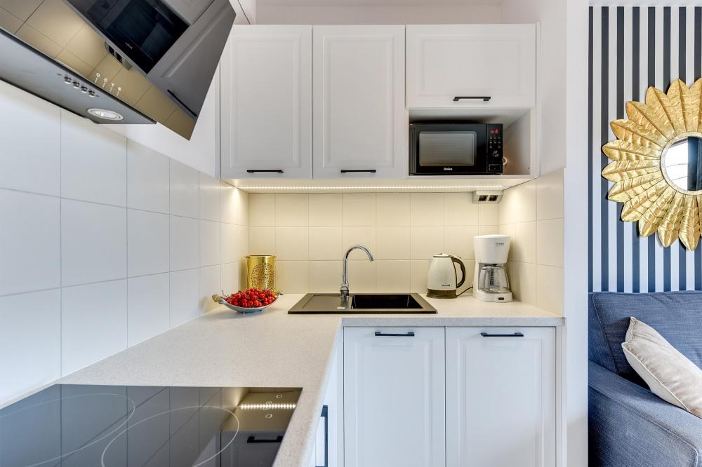 Dette unike premiumstudioet oppfyller forventningene til selv de mest krevende gjestene. Perfekt interiør for et romantisk opphold bare for to og andre anledninger for å tilbringe en fantastisk tid i og rundt Gdansk. Leiligheten er klargjort for oppholdet til 4 gjester fordi det finnes en sovesofa i stueområdet, hvorfra det også finnes et fullt utstyrt tekjøkken og spiseområde. Det mørke, men ikke overveldende designet setter en romantisk og fritidsorientert stemning.