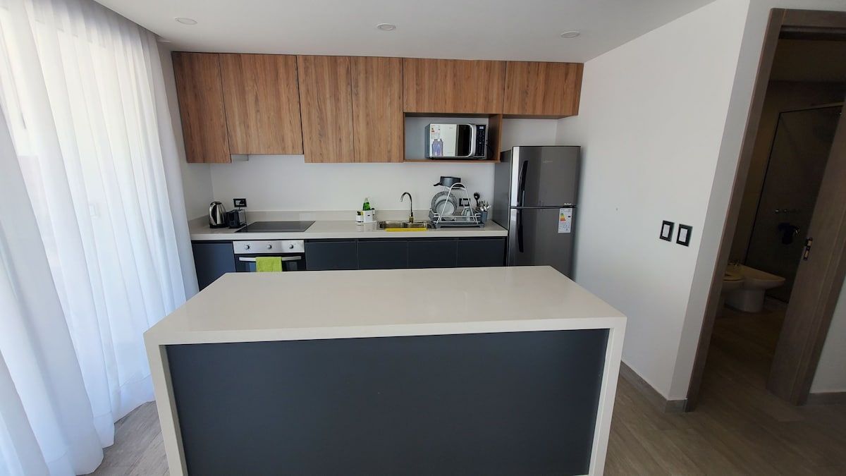 Denne leiligheten er ideell og unik å nyte med familie og venner. Ligger ved sjøkanten, med en treterrasse på sanden, grill og et sett med lenestoler for å nyte utsikten mot kysten. Den har ett soverom, klimaanlegg, uttrekkbar vifte og smart-TV. To bad, fullt kjøkken, uttrekkbar takvifte, klimaanlegg, smart-TV, marine sovesofa og en annen sammenleggbar enkeltseng. Oppvarming av Losa Radiante. Den ligger i et kompleks med utendørsbasseng, badstue og treningsstudio.