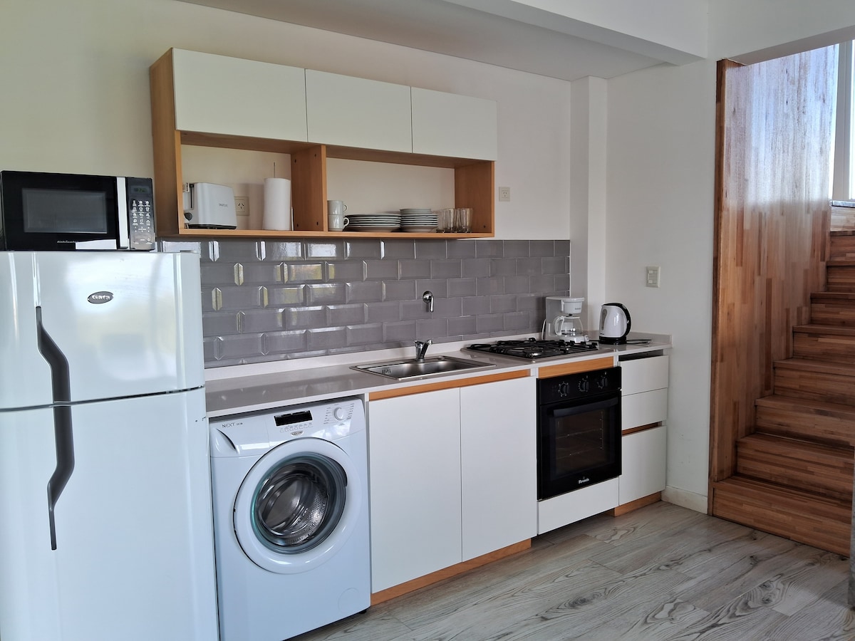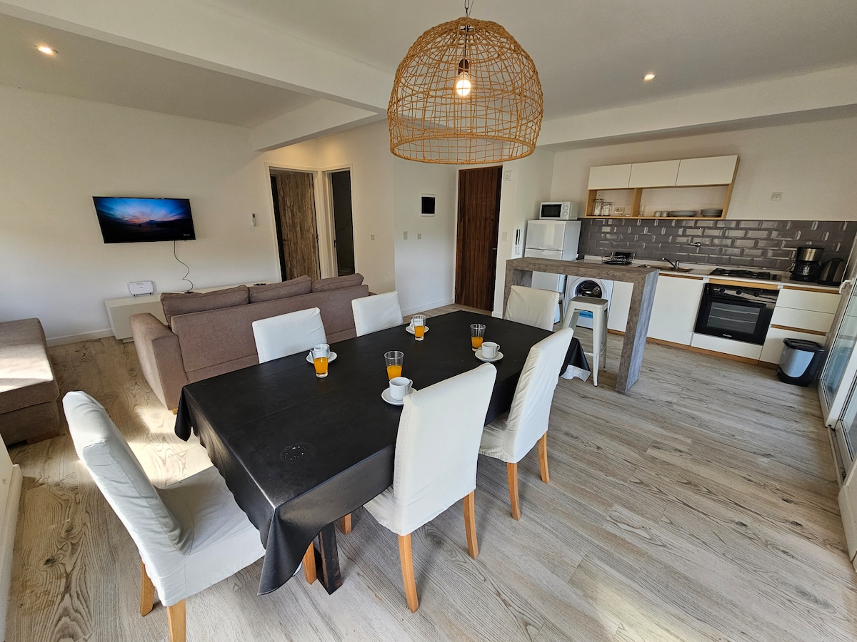 Moderne og funksjonell leilighet. Flott for studenter og turister. I sentrum av Pinamar, et trygt, godt opplyst område med aktivitet året rundt. Omgitt av supermarkeder, apotek og restauranter. 🛏️ Komfortabelt og veldig lyst 🚗 Overbygd garasje i bygningen (standard bil). 🔥 Egen grill og terrasse. 🧺 Vaskemaskin. Hvite 🧼 klær inkludert 🏊♀️ Fasiliteter: basseng, sauna, treningsstudio og mikrocinema. 📍Fem minutter fra havet og UADE og tre minutter fra mikrostasjonen 🚙 RABATTER PÅ UKENTLIGE OVERNATTINGER