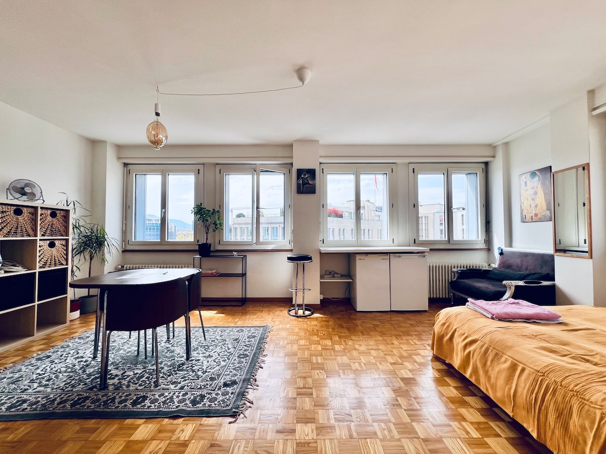 Veldig sentralt, solfylt, stort loft med et utstyrt kjøkken, en balkong og en fin utsikt. 10 minutters gange fra FN (5 med trikk). 1 minutts gangavstand fra sentralstasjonen Cornavin. 5 minutters gange fra innsjøen. 10 minutters gange fra gamlebyen. Stor seng Trådløst nettverk med veldig høy hastighet! Apple-TV 4K. 55 tommers smart-TV med storskjerm. Fullt utstyrt. Ideell for fjernarbeid og lekser Ingen gratis parkering. Nærmeste: «Parking place de Cornavin».
