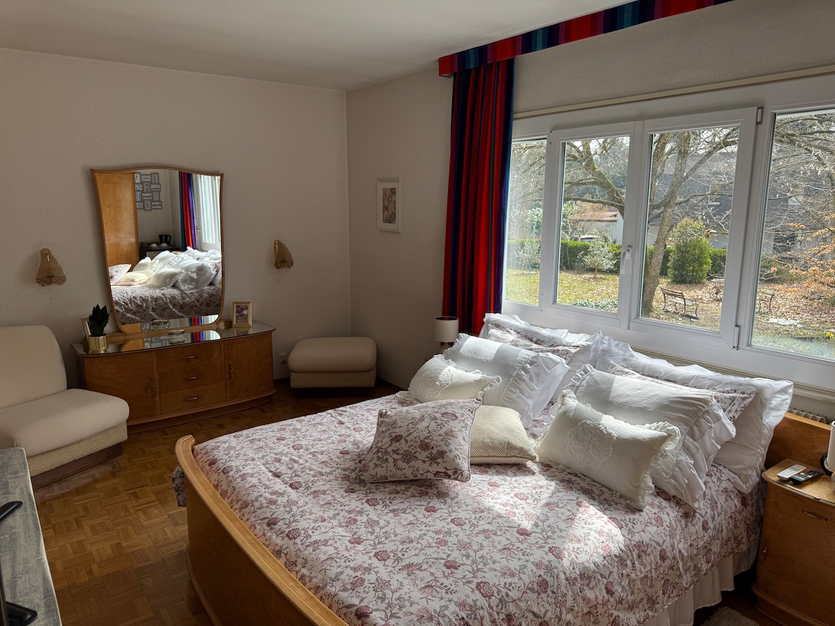 Du vil nyte en villa i en grønn oase i sentrum av Genève. Ideelt for reisende, familier, grupper på opptil 6 personer. Barneseng tilgjengelig. Du vil være i nærheten av butikker, offentlig transport og parker. Innsjøen og stranden ligger 6 minutter unna. Du kan gå turer og stå på ski både i Jura og Alpene. Nærmeste stasjon 16 km.