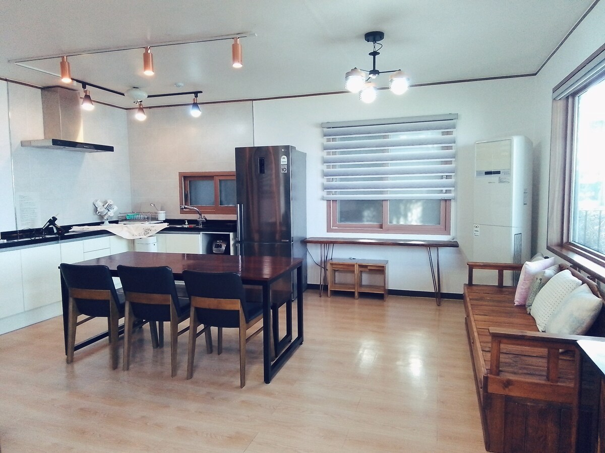 Dette er et rom i Geoje Island Suggalerie Cafe & Pension 's Magpie Room Det er en standardpris for 4 personer, og det kan brukes av opptil 6 personer, og det er en ekstra kostnad på 20 000 won per person for ytterligere inngang. Dette rommet ligger i første etasje og har et soverom og et bad. Det er et separat rom, og det er en romslig stue, kjøkken og ett toalett til. Det er et rom som er ansvarlig for elskelsernes kjærlighetsturer, venners lykke-turer, minneturer med minner for par og til og med en kort familietur. Dette stedet ligger på en annen helbredende øy på Geoje Island, og innkvarteringsbygningen har et galleri som gir en klassisk kafé og et åpent utstillingsområde for kunstnere. Innkvarteringsbygningen ble bygget med et varmt og hyggelig lymotiv ved hjelp av trehusets konstruksjonsmetode, og alle rommene er designet med utsikt over havet, så det er et fantastisk sted å slappe av med havet. Den har en panoramautsikt mot sjøen fra et hvilket som helst rom, og har også en spektakulær utsikt mot kveldssolnedgangen. Du kan nyte en smakfull brunsj i kafeen og ha det privilegium å se unike utstillinger.