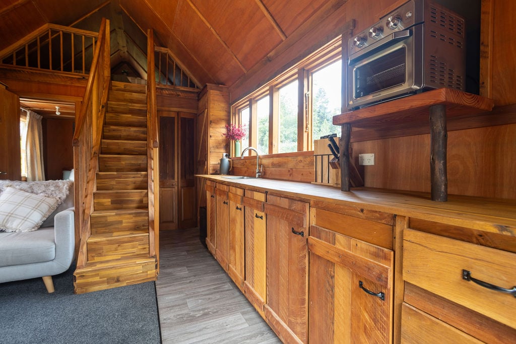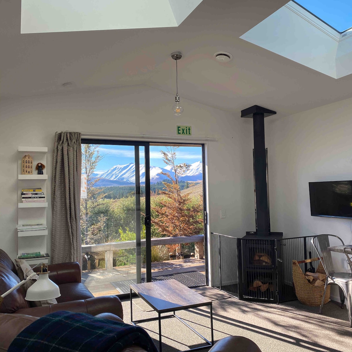 * Luksuriøs, miljøvennlig hytte i utkanten av skogen med fantastisk utsikt over de fire toppene i South Canterbury – med en «no rush»-utsjekking kl. 12.00. * Kingsize-seng med vedovn i stue med åpen planløsning. * Fjærfôret basseng * Vedfyrt boblebad – 70 dollar for én natt (100 dollar for to) * Fantastisk stjernekikking på mørk himmel. Dagsturer til Tekapo, Mount Cook, Ringenes herre, *Geraldine for kafeer/restauranter/museer * Grill og sofa på verandaen, lokal fuglesang, * Koble fra: Skjerm og gratis wifi (tilgang til mobildata)