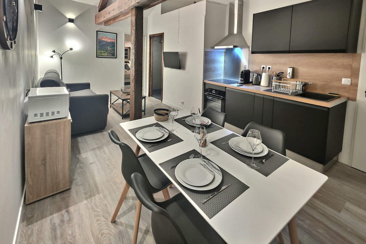 Velkommen til denne kokongen til: Instant Pyrénées. Beliggende under takene, i hjertet av Bagnères-de-Bigorre. Denne sjarmerende leiligheten med synlige bjelker fordyper deg i en varm og naturlig atmosfære, ideell for en romantisk ferie. Innredningen kombinerer tre og grønt for å skape en beroligende atmosfære. Naturlige planter gir et snev av friskhet og ro, mens det private boblebadet under loftet lover øyeblikk av ren avslapning.