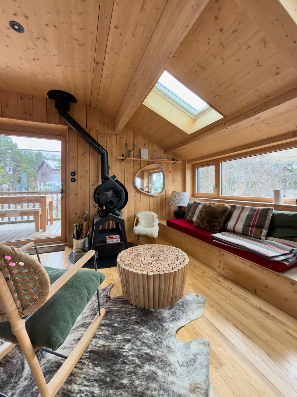 Trehytte med enkle og moderne linjer, som kombinerer moderne komfort og varm dekorasjon med fantastisk utsikt over fjellene, i en liten grend med fem eksklusive hytter, som ligger i et privilegert område på den lille campingplassen vår, utgangspunktet for flere fotturer og aktiviteter. En gratis økt (1,5 timer) i velværeområdet, et eget område av hytta, med helt privat BOBELBAD og SAUNA. Sengetøy og håndklær er ikke inkludert. Leie er mulig.