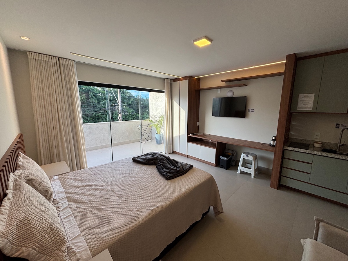 Leilighet med to soverom og klimaanlegg (én suite) i Geribá Apart Hotel Condominium med hotelltjenester (rengjøring, bytte av håndklær og sengetøy), møblert, sosialt bad, stue, kjøkken, balkong, svømmebasseng, badstue, restaurant (frokost ikke tilgjengelig), parkering for én bil. Trenger å gå opp trapper (én etasje). 200 meter fra Geribá-stranden og minutter fra Porto da Barra Gastronomiske senter.