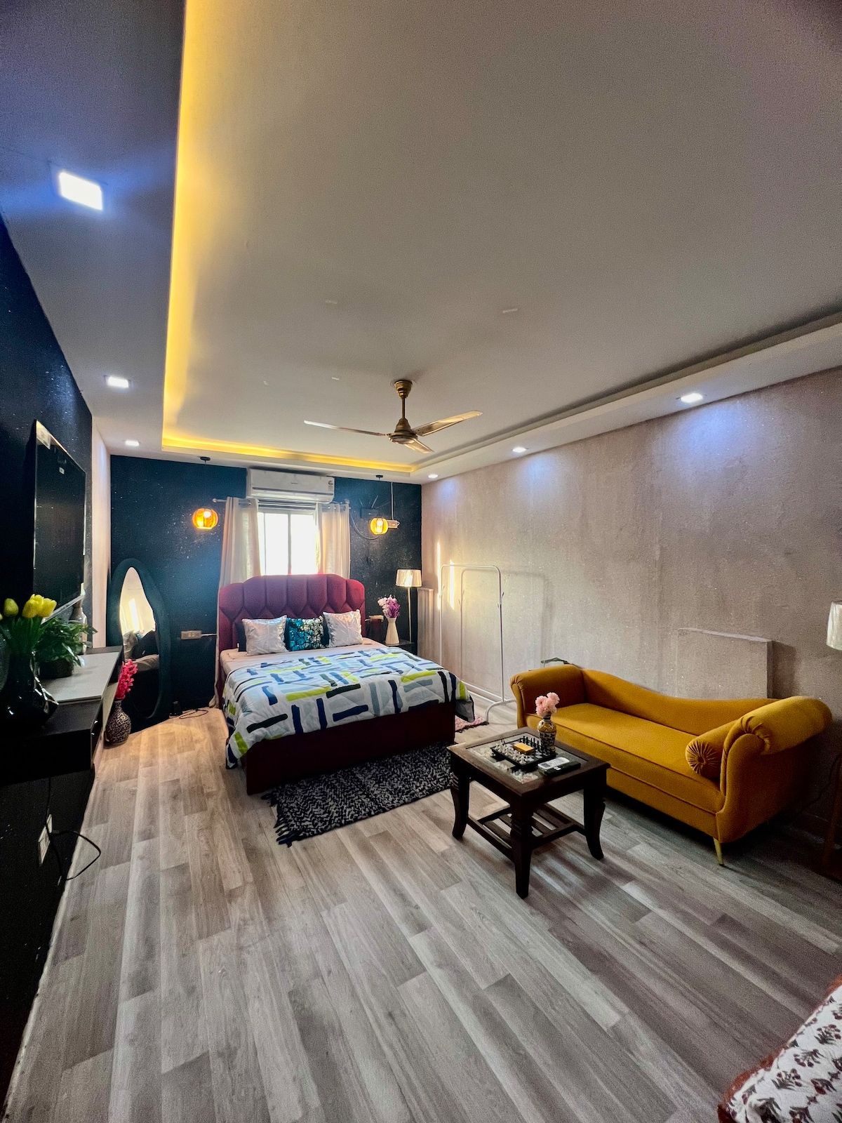 Gå inn i en verden hvor byen forsvinner og magien begynner✨🪄. Under Malviya Nagars åpne himmel venter din private oase på taket - en arabisk khema-hytte med Sheesha (Hukka), en glødende bardisk og en Playstation 4 for lekne netter. Drikk, slapp av og kjør inn i komfort med Netflix og et moderne toalett. Omgitt av en frodig terrassehage, se fly spore natten over mens du synker ned i rent privatliv, romantikk og rolig luksus.🥂🌷🪩