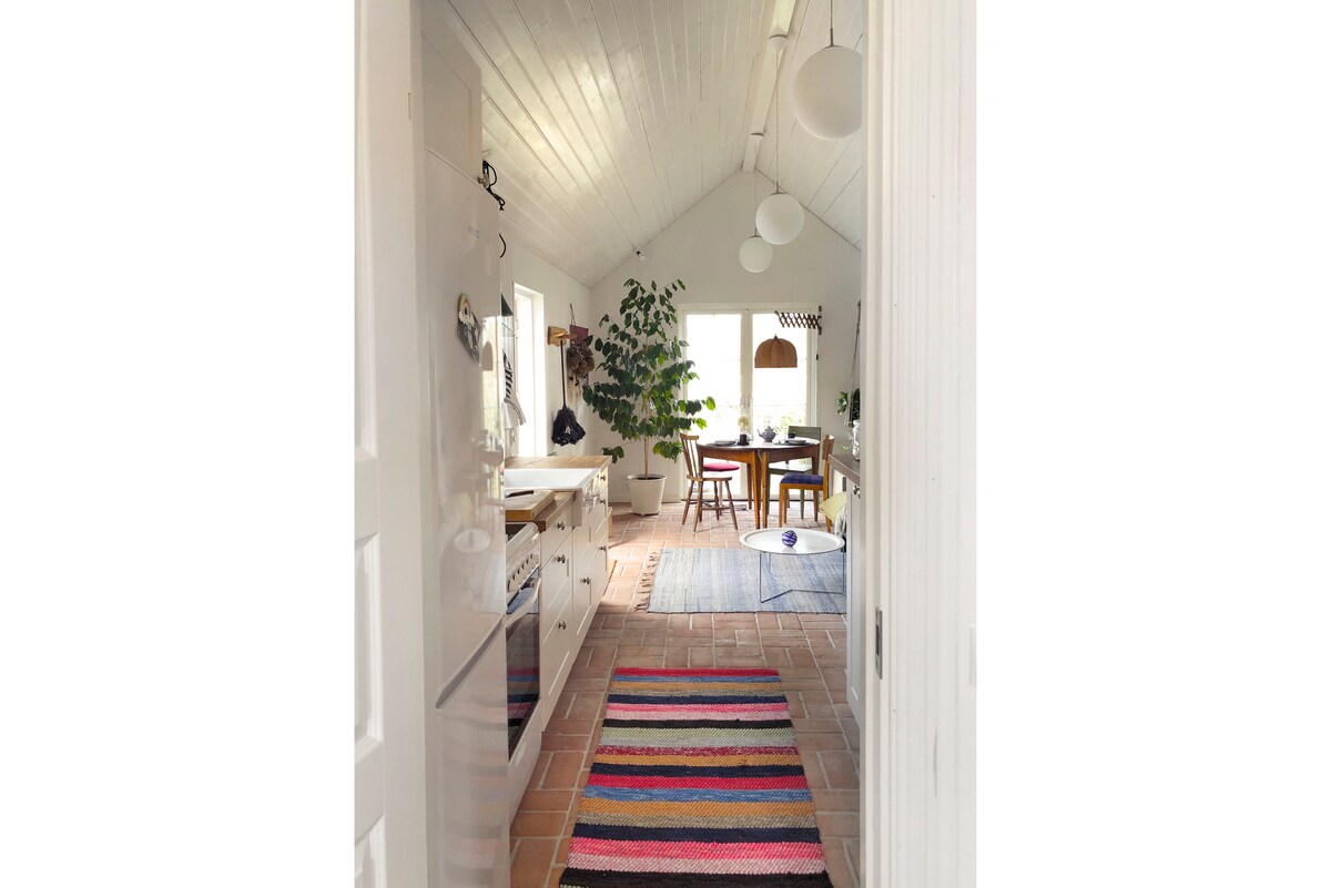 Velkommen til vår koselige loftshytte, bygget i 2021! Du bor adskilt med terrasse i vest i trådgården vår. Hytta er 24 kvm + 9 kvm sovehems med to 140 madrasser. Stige. Det er et soverom, sovehems, stue med sovesofa, kjøkken og et bad. Vi legger litt mat i kjøleskappe, fryseren og spiskammeret som en start. Du har 250 m til et lite badeområde og en lang strandpromenade for jogging og kveldsturer med solnedgang i havet. Se GUIDEBOK. Vi elsker Kullabygden og vil gjerne dele den med deg!