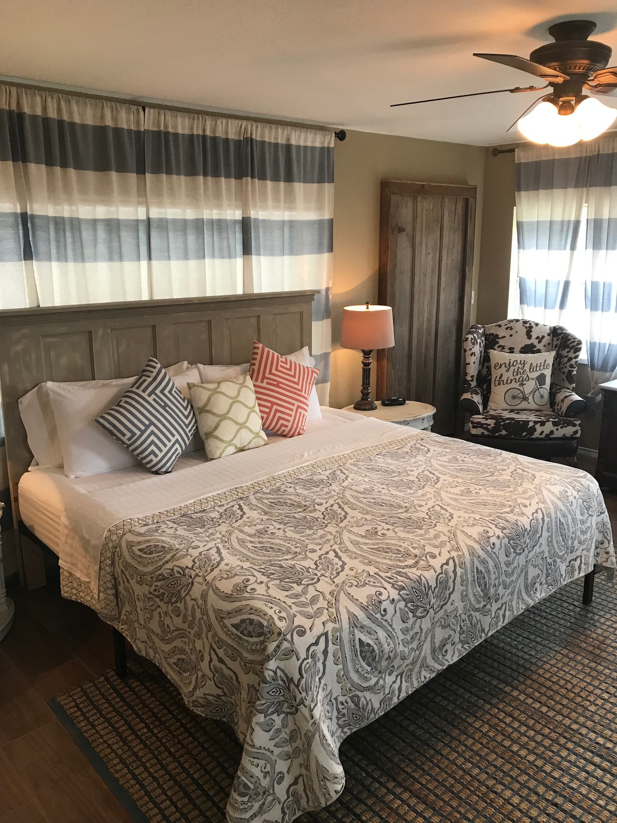 Dra til The Hideaway, et moderne gjestehus i ranchstil designet for komfort og stil. Slapp av ved den dobbeltsidige peisen, nyt det private boblebadet eller slapp av under stjernene ved bålplassen. Med en kingsize-seng, buede tak og en privat gårdsplass tilbyr dette boutique-tilfluktsstedet den perfekte balansen mellom avsondring og nærhet til Fredericksburgs vingårder, restauranter og Main Street.