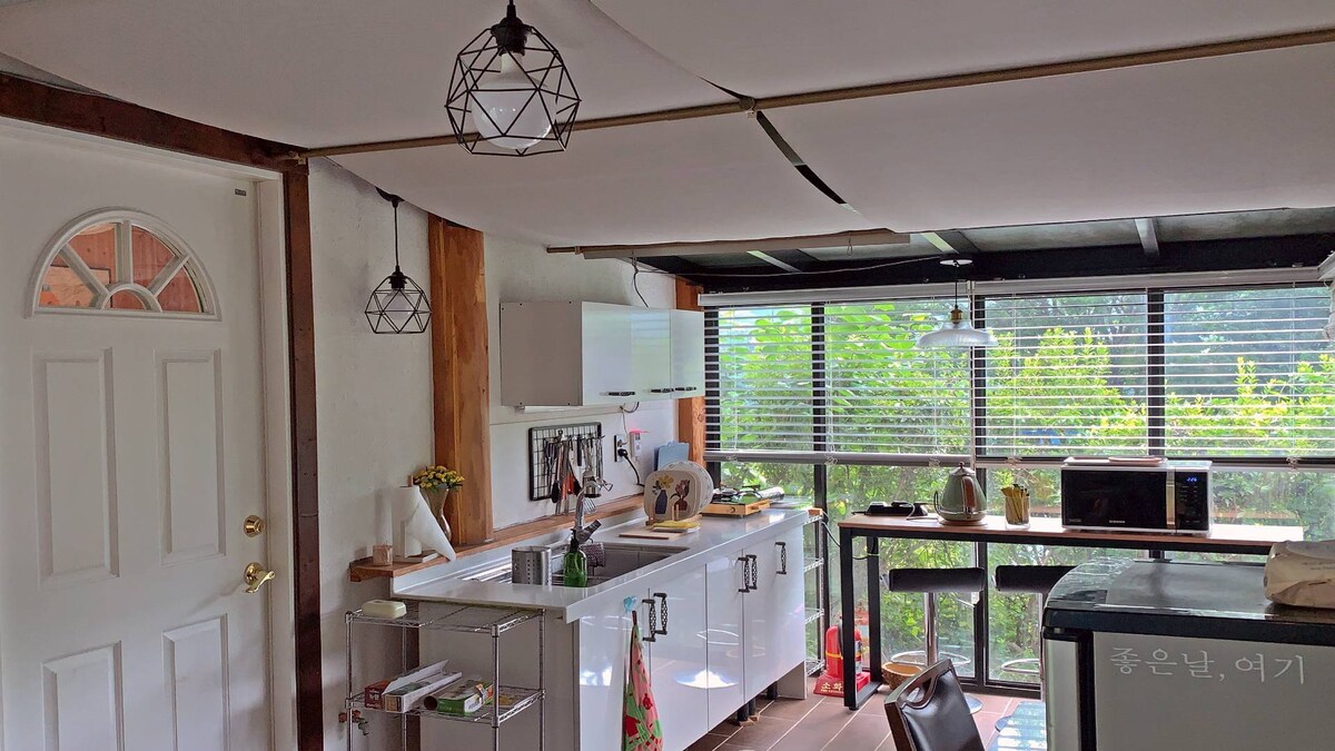 Doamyeongga er et nytt toetasjes landlig hus i et luksuriøst landlig boligkompleks skapt under det uberørte fjellet Eomo-myeon, Kimcheon-si. Du har hele huset på flere etasjer, inkludert en plenhage på 661 kvm (200 pyeong), fire soverom, to bad og en terrasse, til eget bruk etter innsjekking uten vert. Teknologi er lagt under det gjennomsiktige taket på forsiden av hele huset, og en parasoll, et trebord og en stor elektrisk grill er installert, slik at du kan grille kjøtt ute uansett vær. På den romslige plenlekeplassen i den nedre gårdsplassen er det sklier, biler og vipper, slik at barna kan leke så mye de vil. Kjenn den sanne helbredelsen i den pittoreske utsikten over fjellet, den klare luften og den grønne hagen, og nattehimmelen der stjernene strømmer. Vi er stolte av renholdet og gjestenes tilfredshet ved å administrere vertens kjærlige sted direkte, ikke et kommersielt pensjonat.
