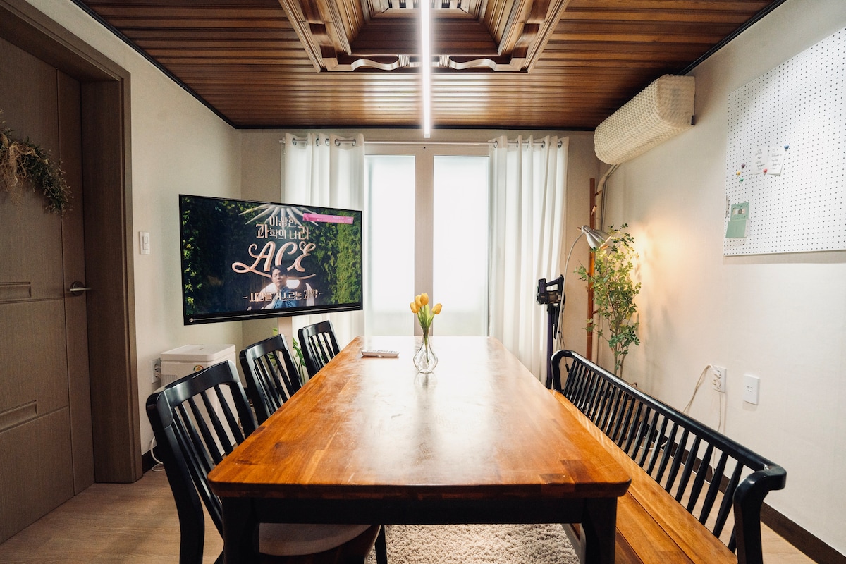 Hele 1. og 2. etasje, tilgjengelig for 2-8 personer, 2 soverom (2 queensize-senger), 2 store stuer (2 queensize-sovesofaer), 2 bad, 1 kjøkken (utstyrt med kjøkkenutstyr), stort valnøttspisebord for 12 personer (4m), brettspill, Nintendo Switch-spill Kjøkken – risgryte, mikrobølgeovn, induksjon, ismaskin, kaffemaskin (espressomaskin), kjøkkenutstyr og krydder, servise, vinglass, kjøleskap Det vakreste overnattingsstedet i hjertet av Seoul med palasset som bakteppe. Du kan nyte helbredelse med utsikt over det hemmelige hageområdet i den uavslørte bakgården til Changdeokgung, og det er nær både T-banestasjonen og kollektivtransport, så det er nok bekvemmelighet for reiser. Administratoren bor 10 minutter unna, så du kan når som helst få hjelp. ** Det er ingen parkeringsplass, men en offentlig parkeringsplass ligger 5 minutters gange unna.