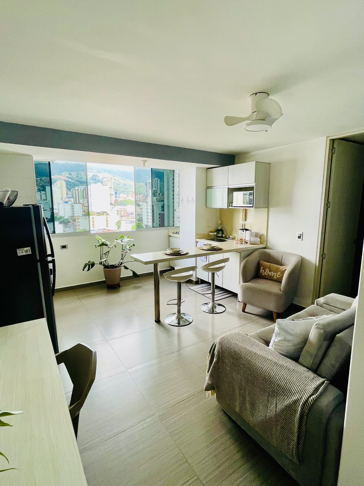 Moderno apartamento en altos de cabecera, cerca de universidades y centros comerciales, ideal para descansar, trabajar o turistear, cuenta con cama queen sabanas 300 hilos, aire acondicionado, cocina equipada , zona de trabajo, sala con tv. Acceso a terraza, lavandería, bahia parqueo no cubierto frente a la propiedad, maquina dispensadora de snack y bebidas. Cerradura digital. Bienvenidos!
