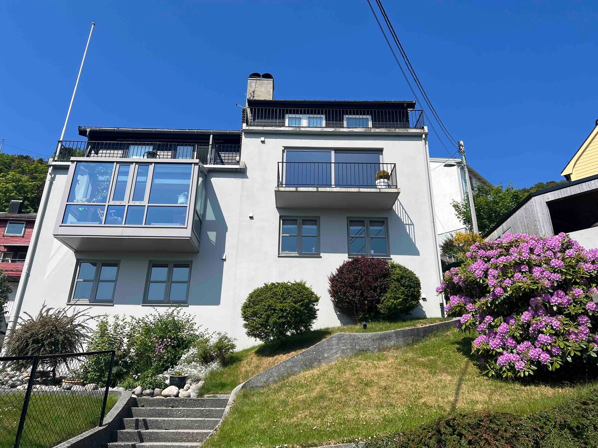 Dette spesielle stedet ligger på toppen av en liten bakke, med nydelig utsikt til fjell og sjø. Umiddelbar nærhet til byens sentrum med restauranter, matbutikk og bakeri. Kort vei til byfjell og et sjøbad med badstue om det skulle friste. Her har du alt du trenger for en helgetur eller lenger opphold. Hus med egen inngang og hage og gratis parkering med elbillader. Velkommen om du reiser alene, er en liten familie eller to par. Som gjest hos oss får du kaffe, deilig sengetøy og håndklær!