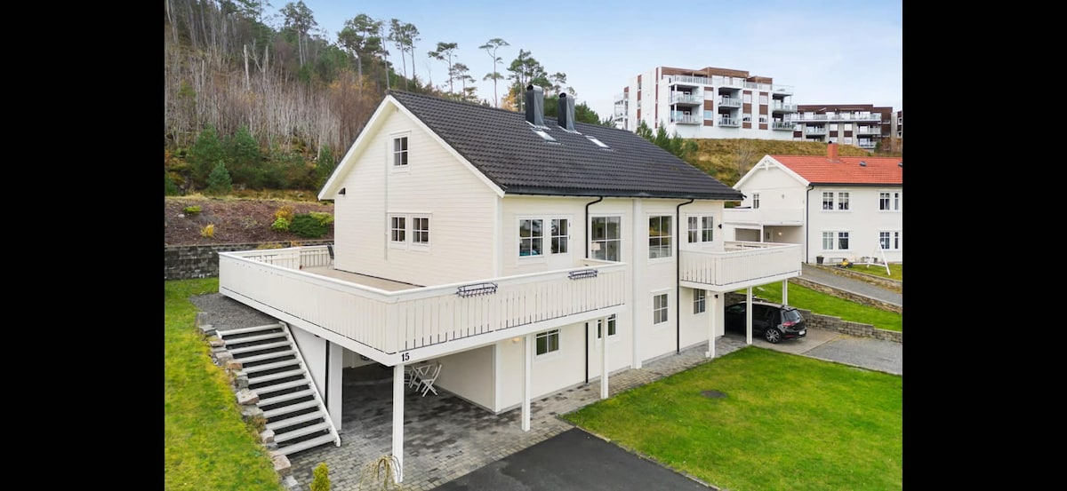 Hus med fantastisk utsikt, uteplass og garasje med elbil-lader i Ålesund sentrum. Du har tilgang til tre etasjer med stue, kjøkken, 2 bad, 3 soverom, vaskerom, kjellerstue med dobbel sovesofa, veranda med fantastisk utsikt over sentrum og Sunnmørsalpene og en lun og koselig uteplass med grill. Det er sengeplasser til 7, hvorav to er på sovesofa i kjelleren. For å ligge så nærme sentrum er det et stille og rolig nabolag uten gjennomgangstrafikk.