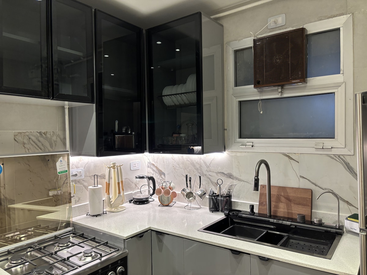 En HEL LEILIGHET med en bakgård som ligger i et vakkert og grønt område i et fredelig integrert samfunn som oppfyller alle beboernes behov. Rommene er nyinnredet, har aircondition, smart-TV og alle fasiliteter du trenger, superRENE og STILLE. Leiligheten ligger 25 minutter fra Kairo internasjonale flyplass. Kaffebarer, restauranter, supermarkeder og apotek ligger alle i nærheten. Hotellstandard kvalitet med hjemmelig komfort til en RIMELIG PRIS.