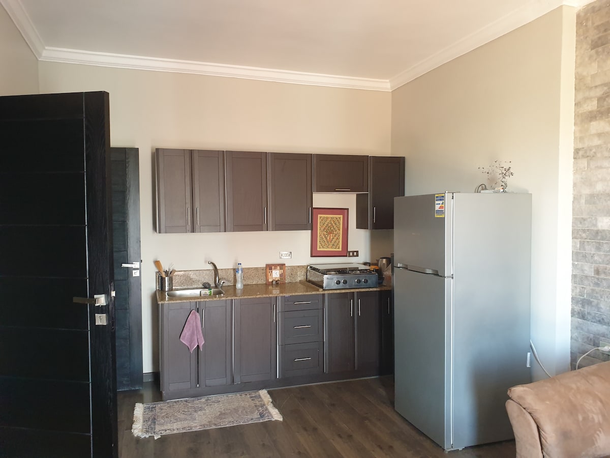 Dette er et koselig, men likevel veldig romslig studio som ser ut som et pyramide-/trehus... som ligger i et veldig fint nabolag med alle fasiliteter tilgjengelig rundt. Det er 2 minutters gang fra et tjenestekjøpesenter (supermarked, vaskeri, kafeer, restauranter, apotek). 15 minutters kjøretur til pyramidene og det nye egyptiske museet. 25 minutters kjøretur til sentrum.