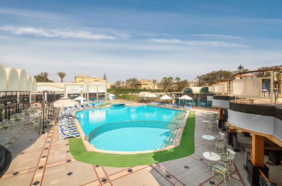 Ultimate escape in Cairo, just steps from the Great Pyramids—where mornings begin by the pool, afternoons unfold in the spa or on city tours, and evenings wind down with live music and cocktails. With family perks like a kids’ club and playground, plus top dining and nearby horseback rides, this resort blends comfort with a touch of wonder.