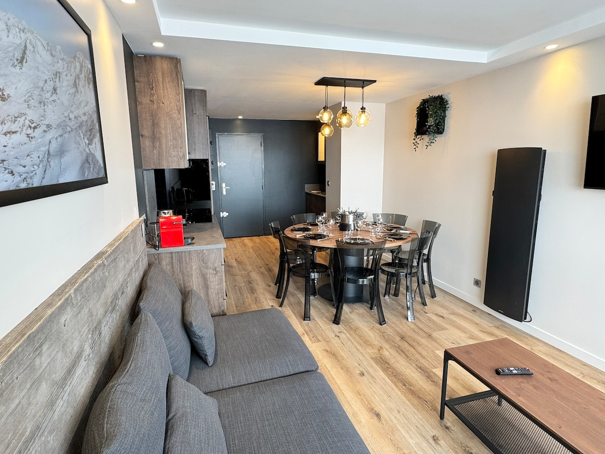 Eksepsjonelt studio ved foten av bakkene - Courchevel 1550 Denne renoverte studioleiligheten ligger ideelt til rett ved skibakken, og tilbyr tilgang til ski direkte fra døren i den populære Lou Rei-residensen. Det ligger noen få skritt fra butikker, restauranter og heiser, og har en sikret overbygd parkeringsplass. Om vinteren tar Grangettes-gondolen deg til Courchevel 1850 på mindre enn 5 minutter (kl. 08.00–23.00). Nyt en raffinert ramme, som kombinerer komfort, eleganse og praktiskhet, med en fantastisk utsikt over fjellene. ☀️🏔️❄️