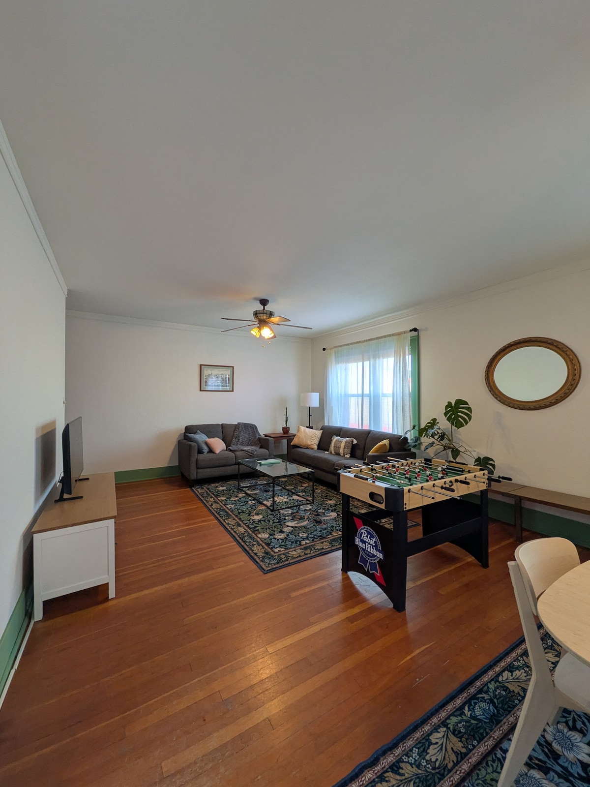 Koselig leilighet i andre etasje i et Craftsman-hjem fra århundreskiftet. Et lite soverom med queensize-seng, fullt kjøkken og bad, stue med et lite område som er avskjermet med gardiner og har en kommode og en enkeltseng (dette rommet har ikke dør, men har mørkleggingsgardiner for å skille rommet fra stuen). Foajeen deles med leiligheten i første etasje, men hver leilighet har en egen sikker dør. Denne leiligheten er ikke egnet for sykkeloppbevaring. Ingen sykler i leiligheten.