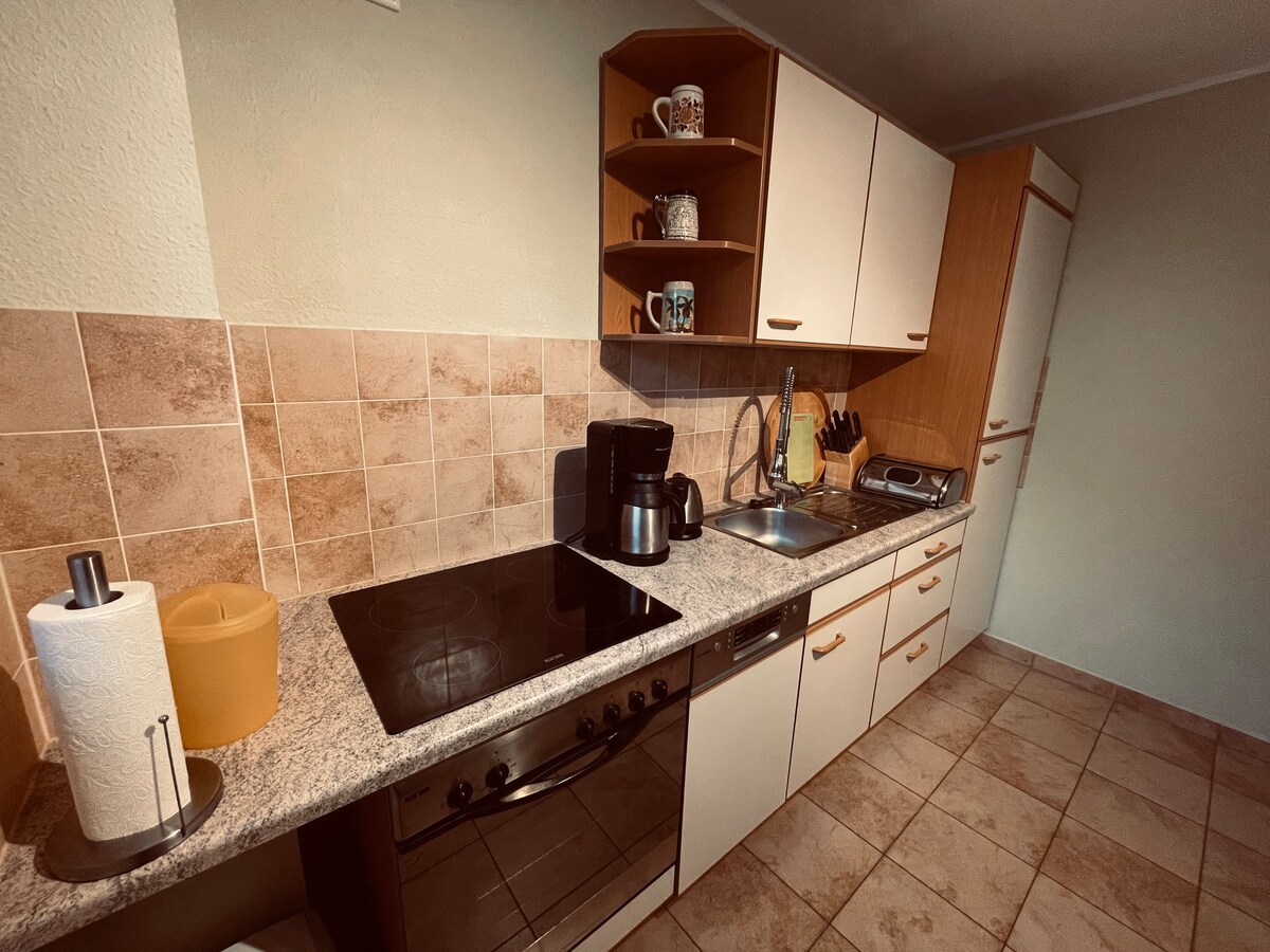 Ferieleiligheten er en romslig kjellerleilighet med terrasse og plass til opptil 5 personer. Leiligheten ligger i gangavstand fra sentrum og ligger midt i grønne omgivelser. Nyt den vidstrakte naturen i vårt distrikt med de mange innsjøene og skogene, sjarmen til herregårdene og de små omkringliggende landsbyene med sine kirker og respektive særpreg. Ferieleiligheten vår er klassifisert med 4 stjerner av den tyske turistforeningen.