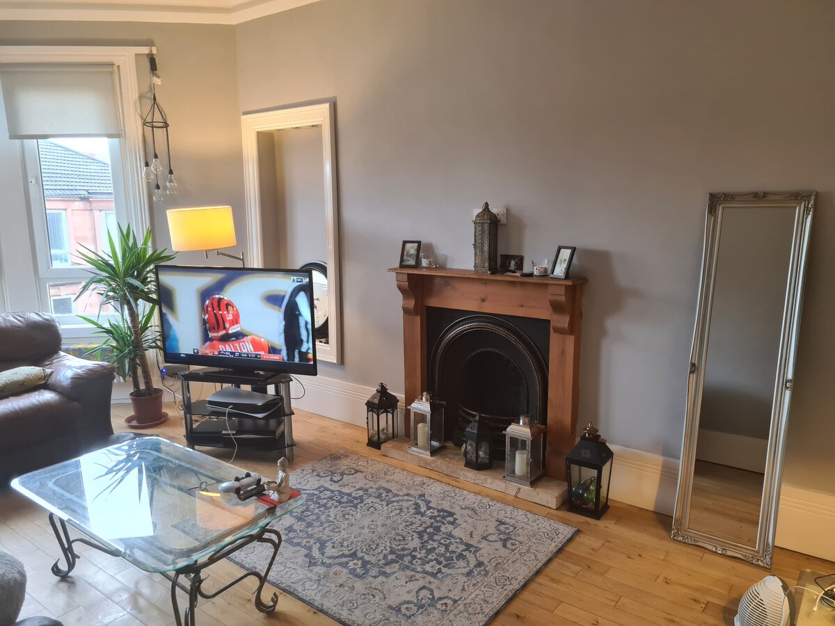 5/10 minutters gange til restauranter, barer, supermarkeder, Greenock sentrum, fritidskompleks med treningsstudio + svømmebasseng og 5 minutters gange til Greenock sentralstasjon for enkle turer til Glasgow, Edinburgh eller nærliggende områder som Largs eller Gourock. Romslig stue med smart-TV, stor hjørnesofa, svingstol, DVD-er og brettspill. To soverom, ett med dobbeltseng og ett med to enkeltsenger, begge med smart-TV. Gjester har tilgang til eget kjøkken med alle fasiliteter og bad.